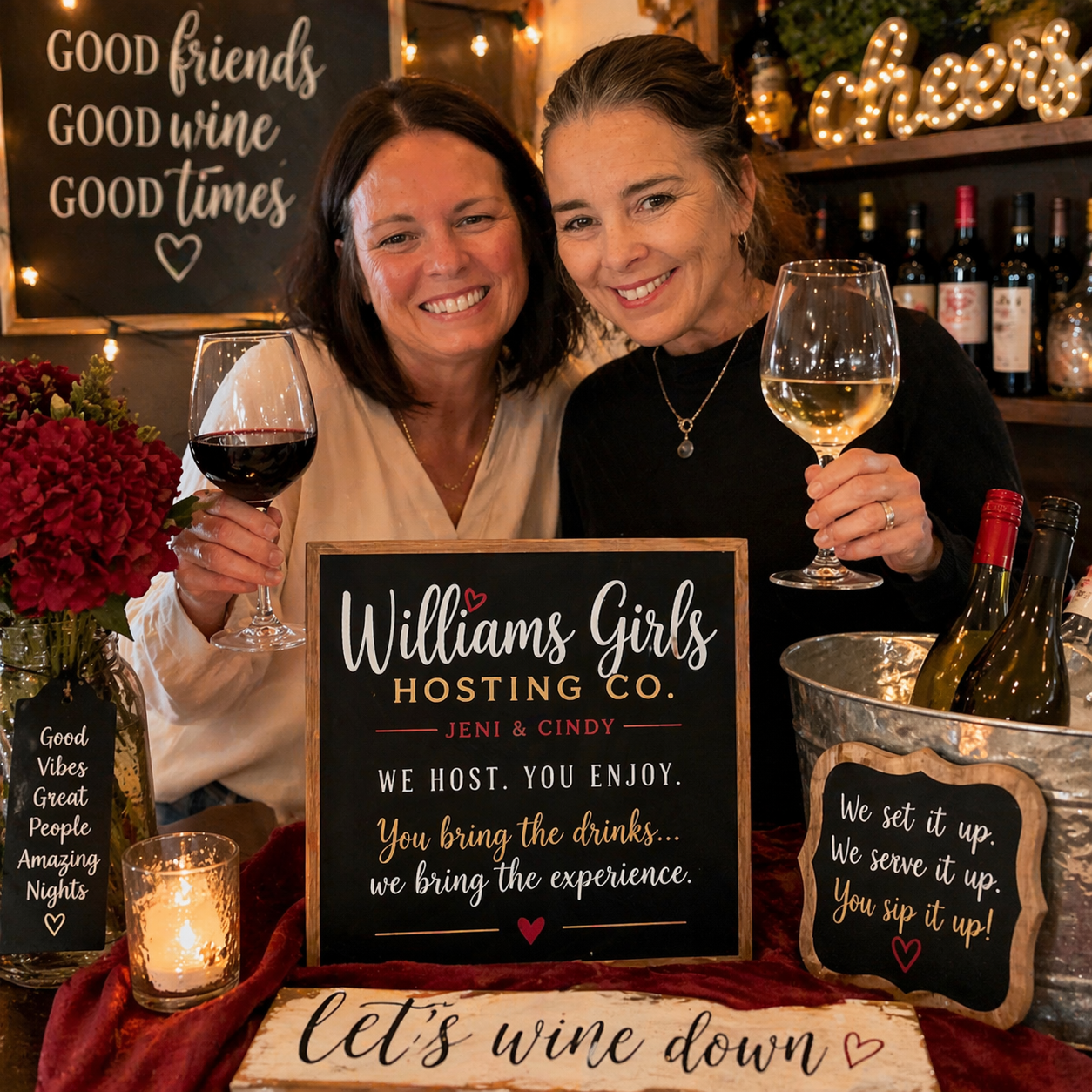 At the heart of Williams Girls Hosting Co. are Jeni and Cindy, who share a profound love for people, connection, and creating moments that truly matter. We enjoy the simple things—good conversation, genuine laughter, and the feeling of a space where everyone feels comfortable and cared for.